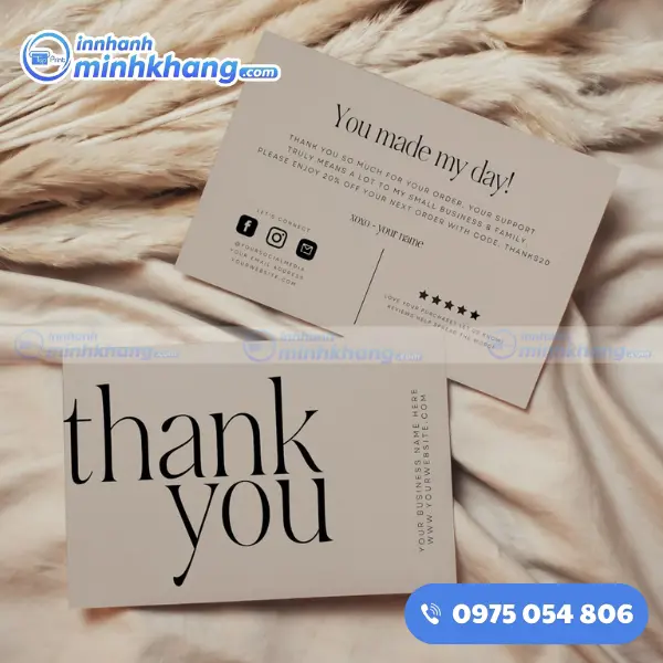 Với phương châm đặt sự hài lòng của khách hàng lên hàng đầu, In Nhanh Minh Khang cam kết mỗi tấm card cảm ơn xuất xưởng đều là một sản phẩm hoàn hảo, giúp bạn chinh phục niềm tin của người mua ngay từ cái nhìn đầu tiên.